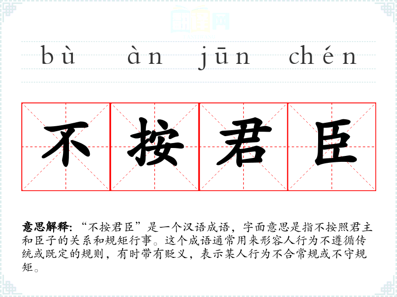 “不按君臣”是一个汉语成语,字面意思是指不按照君主和臣子的关系和规矩行事。这个成语通常用来形容人行为不遵循传统或既定的规则,有时带有贬义,表示某人行为不合常规或不守规矩。