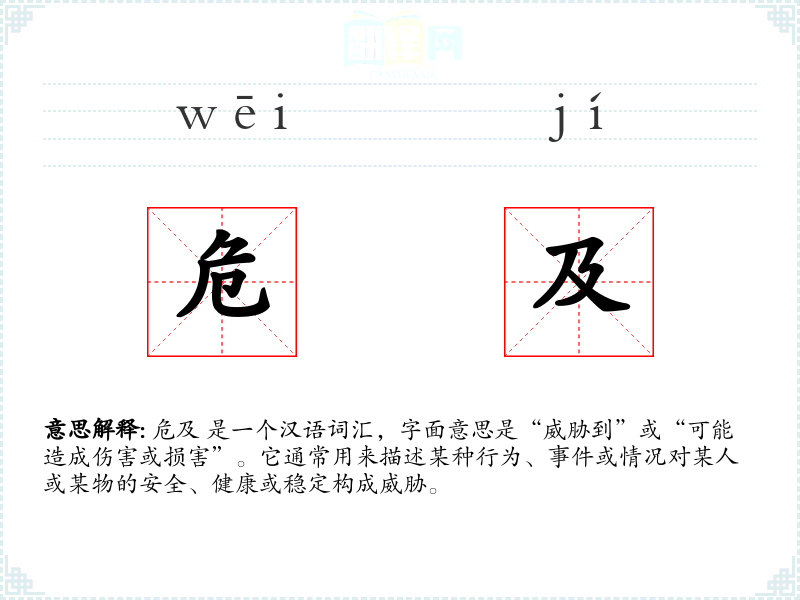 危及 是一个汉语词汇,字面意思是“威胁到”或“可能造成伤害或损害”。它通常用来描述某种行为、**或情况对某人或某物的安全、健康或稳定构成威胁。