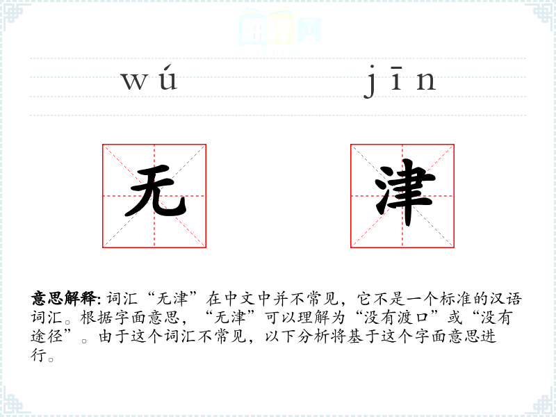 词汇“无津”在中文中并不常见,它不是一个标准的汉语词汇。根据字面意思,“无津”可以理解为“没有渡口”或“没有途径”。由于这个词汇不常见,以下分析将基于这个字面意思进行。