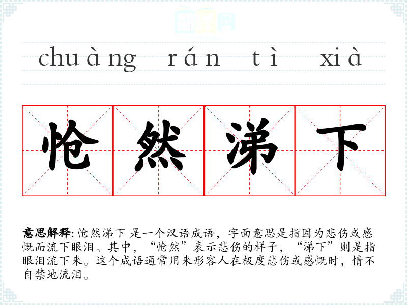 怆然涕下 是一个汉语成语,字面意思是指因为悲伤或感慨而流下眼泪。其中,“怆然”表示悲伤的样子,“涕下”则是指眼泪流下来。这个成语通常用来形容人在极度悲伤或感慨时,情不自禁地流泪。