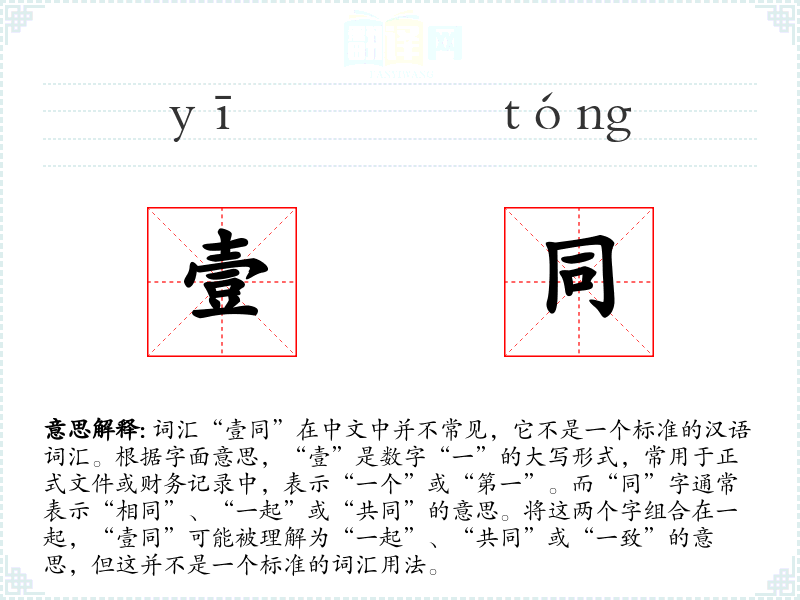 “壹”和“同”都是古汉语中常用的字,但“壹同”作为一个组合词汇并不常见,可能是近年来在特定场合或网络用语中出现的。