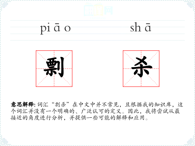 词汇“剽杀”在中文中并不常见,且根据我的知识库,这个词汇并没有一个明确的、广泛认可的定义。因此,我将尝试从最接近的角度进行分析,并提供一些可能的解释和应用。