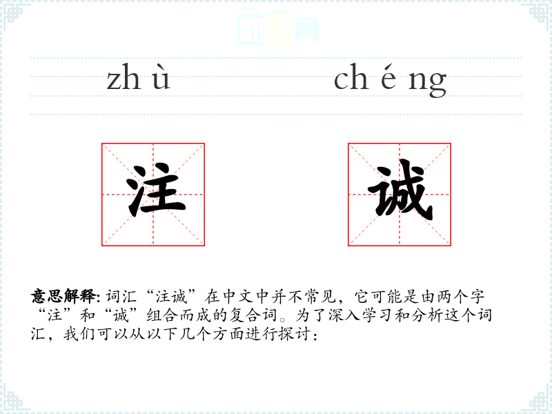 “注诚”这个词汇强调了真诚和专注的重要性,无论是在个人修养还是社会交往中都具有重要意义。通过学*和使用这个词汇,我们可以更好地理解和表达真诚与专注的价值。