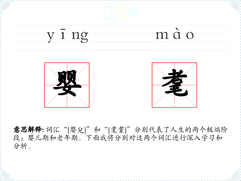 词汇“[婴兒]”和“[耄耋]”分别代表了人生的两个极端阶段:婴儿期和老年期。下面我将分别对这两个词汇进行深入学*和分析。
