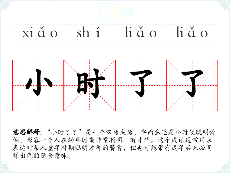 “小时了了”是一个汉语成语,字面意思是小时候聪明伶俐,形容一个人在幼年时期非常聪明、有才华。这个成语通常用来表达对某人童年时期聪明才智的赞赏,但也可能带有成年后未必同样出色的隐含意味。