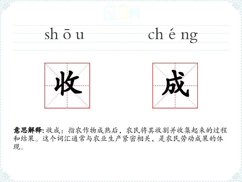 收成:指农作物成熟后,农民将其收割并收集起来的过程和结果。这个词汇通常与农业生产紧密相关,是农民劳动成果的体现。