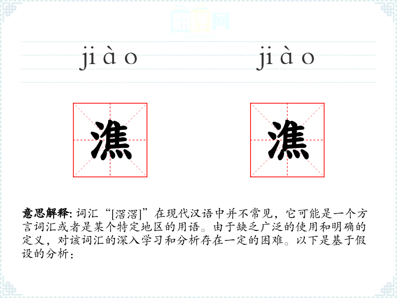 词汇“[滘滘]”在现代汉语中并不常见,它可能是一个方言词汇或者是某个特定地区的用语。由于缺乏广泛的使用和明确的定义,对该词汇的深入学习和分析存在一定的困难。以下是基于假设的分析: