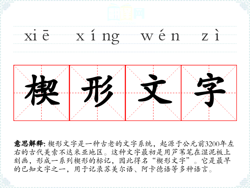 同义词:泥板文字、古代美索不达米亚文字 反义词:现代文字(如拉丁字母、汉字等)