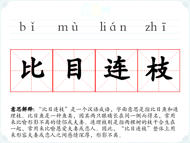 “比目连枝”是一个汉语成语,字面意思是指比目鱼和连理枝。比目鱼是一种鱼类,因其两只眼睛长在同一侧而得名,常用来比喻形影不离的情侣或夫妻。连理枝则是指两棵树的枝干合生在一起,常用来比喻恩爱夫妻或恋人。因此,“比目连枝”整体上用来形容夫妻或恋人之间感情深厚,形影不离。