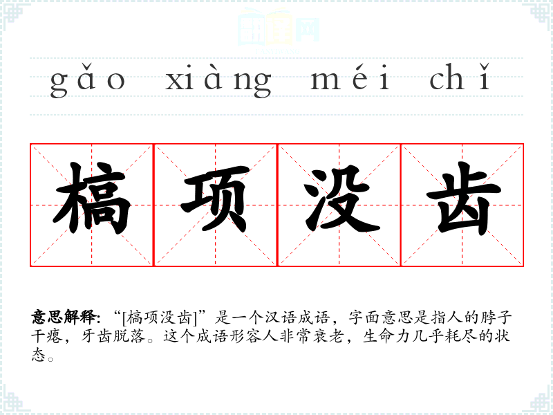 “[槁项没齿]”是一个汉语成语,字面意思是指人的脖子干瘪,牙齿脱落。这个成语形容人非常衰老,生命力几乎耗尽的状态。