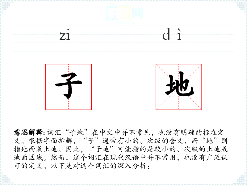 “子地”这个词汇在现代汉语中并不常用,也没有明确的定义和广泛的应用。在语言学习和表达中,它不是一个重要的词汇。如果遇到类似的词汇,应结合具体语境和文献来理解其含义。