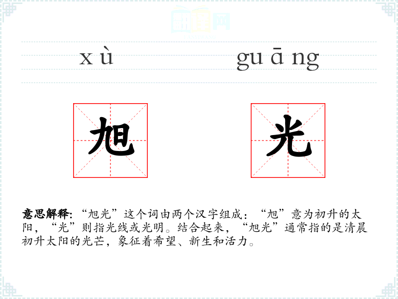 “旭光”这个词由两个汉字组成:“旭”意为初升的太阳,“光”则指光线或光明。结合起来,“旭光”通常指的是清晨初升太阳的光芒,象征着希望、新生和活力。