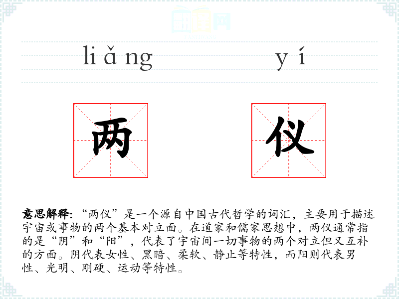 - 反义词:无(因为“两仪”本身描述的是一对对立的概念,所以没有直接的反义词)