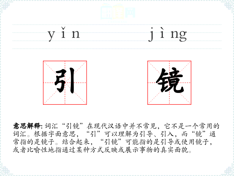- 在古代文献中,“引镜”可能被用来描述通过镜子观察或反映事物。