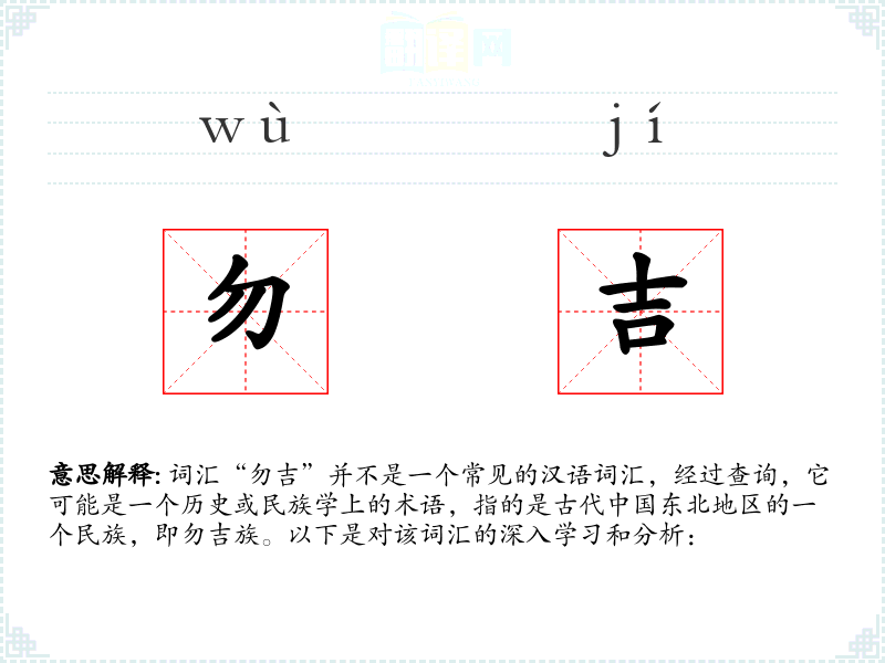 词汇“勿吉”并不是一个常见的汉语词汇,经过查询,它可能是一个历史或民族学上的术语,指的是古代*东北地区的一个民族,即勿吉族。以下是对该词汇的深入学和分析: