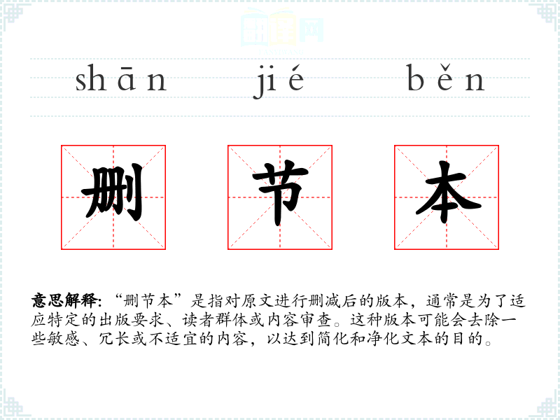 “删节本”一词源于中文,其中“删节”意味着删除部分内容,“本”指版本。随着出版业的发展,这个词逐渐被广泛使用,尤其是在文学和出版领域。