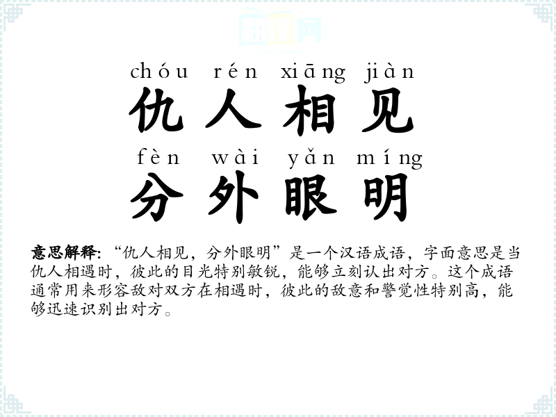 “仇人相见,分外眼明”是一个汉语成语,字面意思是当仇人相遇时,彼此的目光特别敏锐,能够立刻认出对方。这个成语通常用来形容敌对双方在相遇时,彼此的敌意和警觉性特别高,能够迅速识别出对方。