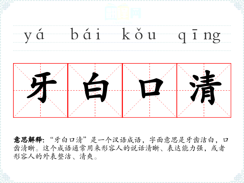 “牙白口清”是一个汉语成语,字面意思是牙齿洁白,口齿清晰。这个成语通常用来形容人的说话清晰、表达能力强,或者形容人的外表整洁、清爽。