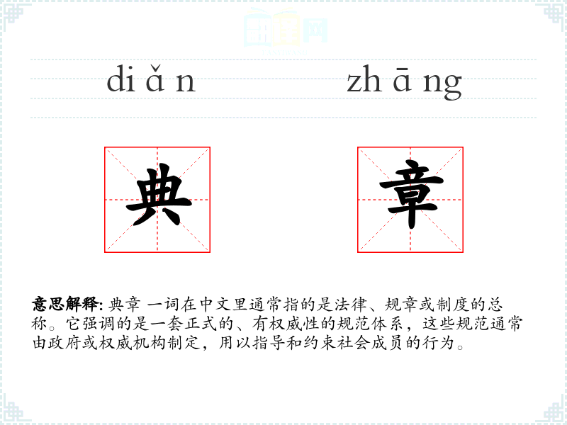 典章 一词在中文里通常指的是法律、规章或制度的总称。它强调的是一套正式的、有权威性的规范体系,这些规范通常由政府或权威机构制定,用以指导和约束社会成员的行为。