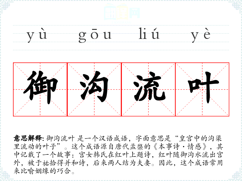 御沟流叶 是一个汉语成语,字面意思是“皇宫中的沟渠里流动的叶子”。这个成语源自唐代孟棨的《本事诗·情感》,其中记载了一个故事:宫女韩氏在红叶上题诗,红叶随御沟水流出宫外,被于祐拾得并和诗,后来两人结为夫妻。因此,这个成语常用来比喻姻缘的巧合。