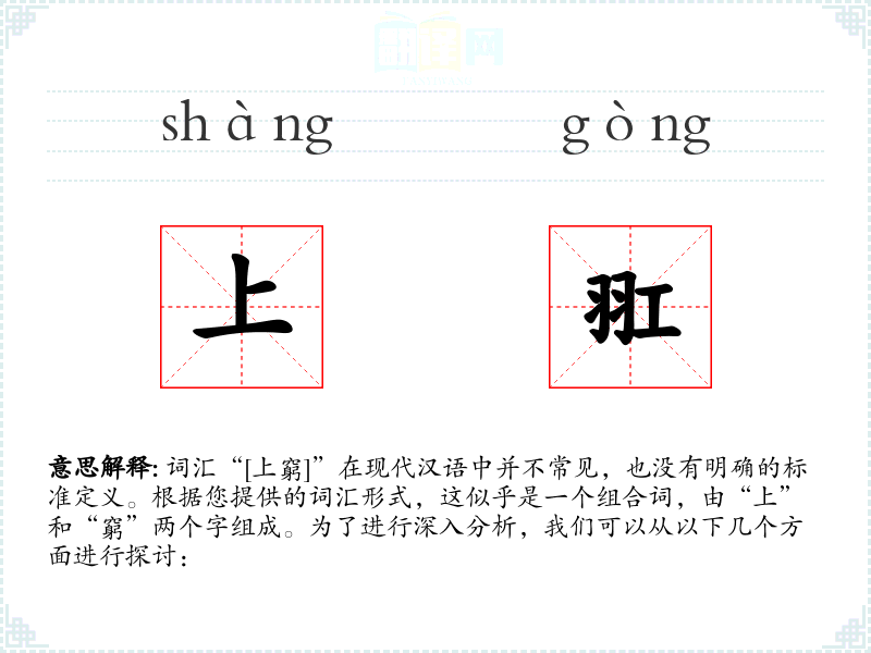 词汇“[上窮]”在现代汉语中并不常见,也没有明确的标准定义。根据您提供的词汇形式,这似乎是一个组合词,由“上”和“窮”两个字组成。为了进行深入分析,我们可以从以下几个方面进行探讨: