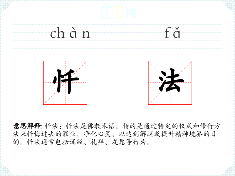 忏法一词源自,其梵文为“Kṣānti”,意为忍耐、宽容。随着的传播,忏法逐渐成为一种特定的修行方法,用于帮助信徒净化心灵,消除业障。
