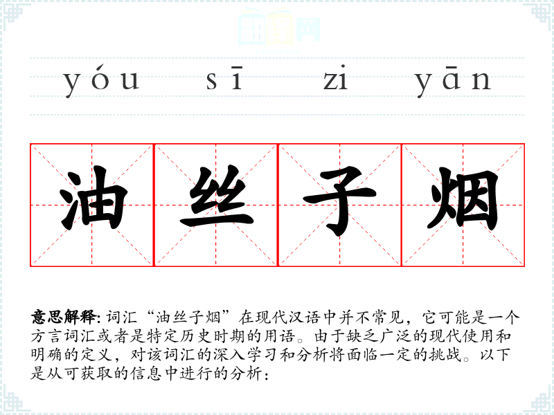 词汇“油丝子烟”在现代汉语中并不常见,它可能是一个方言词汇或者是特定历史时期的用语。由于缺乏广泛的现代使用和明确的定义,对该词汇的深入学习和分析将面临一定的挑战。以下是从可获取的信息中进行的分析: