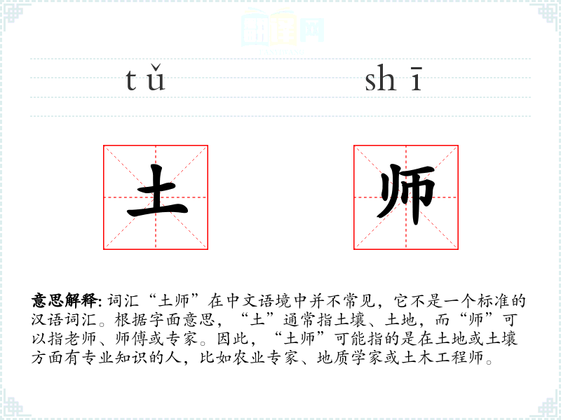 词汇“土师”在中文语境中并不常见,它不是一个标准的汉语词汇。根据字面意思,“土”通常指土壤、土地,而“师”可以指老师、师傅或专家。因此,“土师”可能指的是在土地或土壤方面有专业知识的人,比如农业专家、地质学家或土木工程师。