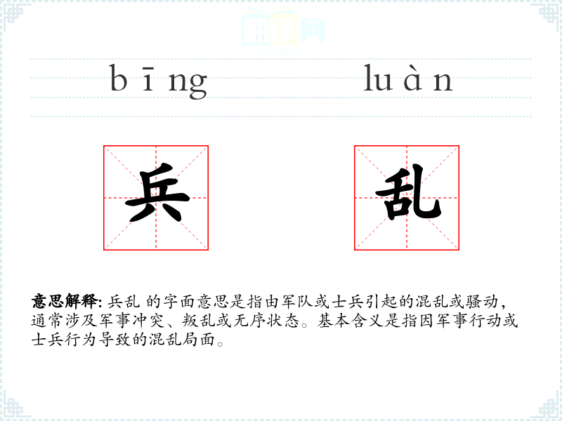 兵乱 的词源可以追溯到古代汉语,其中“兵”指军队或士兵,“乱”指混乱或无序。随着时间的推移,这个词的含义逐渐固定,特指由军队引起的混乱。