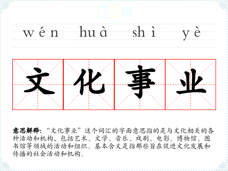 “文化事业”这个词汇的字面意思指的是与文化相关的各种活动和机构,包括艺术、文学、音乐、戏剧、电影、博物馆、图书馆等领域的活动和组织。基本含义是指那些旨在促进文化发展和传播的社会活动和机构。