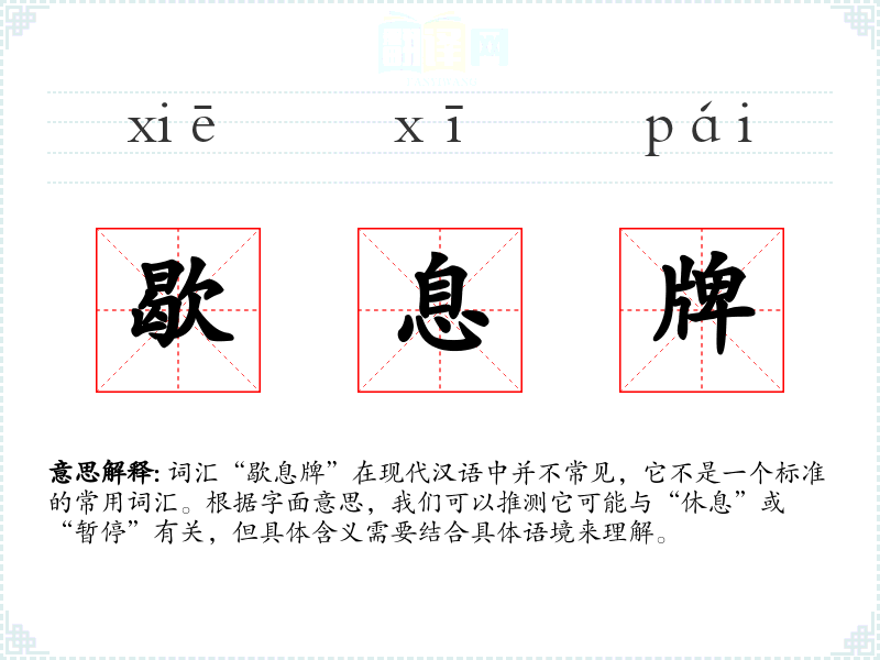 由于“歇息牌”不是一个常用词汇,其词源和历史演变难以考证。它可能是由“歇息”(休息)和“牌”(标志)两个词组合而成的新词。