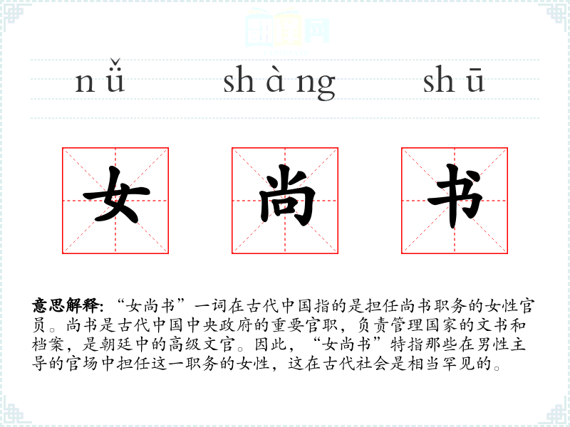 - 反义词:男尚书(指担任相同职务的男性官员)