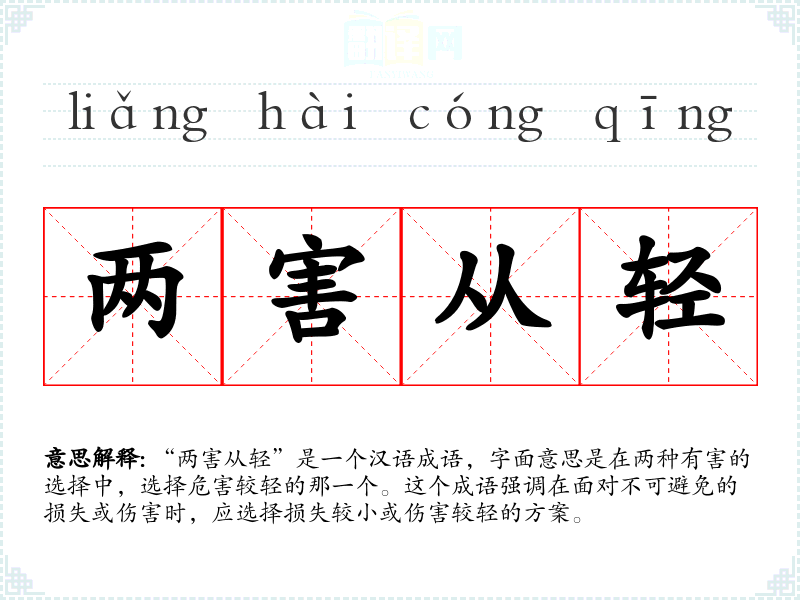 “两害从轻”是一个汉语成语,字面意思是在两种有害的选择中,选择危害较轻的那一个。这个成语强调在面对不可避免的损失或伤害时,应选择损失较小或伤害较轻的方案。