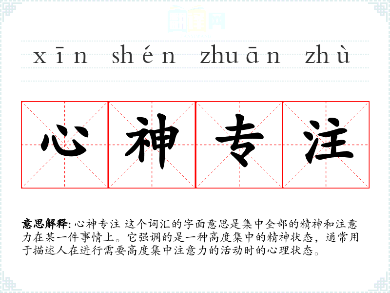 心神专注 这个词汇的字面意思是集中全部的精神和注意力在某一件事情上。它强调的是一种高度集中的精神状态,通常用于描述人在进行需要高度集中注意力的活动时的心理状态。