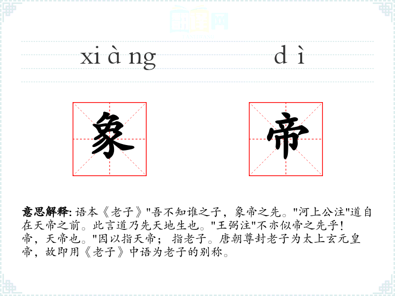 1.语本《老子》"吾不知谁之子,象帝之先。"河上公注"道自在天帝之前。此言道乃先天地生也。"王弼注"不亦似帝之先乎!帝,天帝也。"因以指天帝; 指老子。唐朝尊封老子为太上玄元皇帝,故即用《老子》中语为老子的别称。