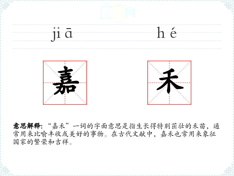 “嘉禾”一词的字面意思是指生长得特别茁壮的禾苗,通常用来比喻丰收或美好的事物。在古代文献中,嘉禾也常用来象征国家的繁荣和吉祥。