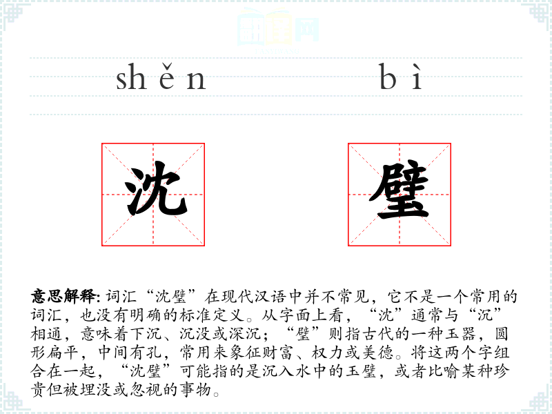 由于“沈璧”不是一个常用词汇,其词源和历史演变不详。它可能是由两个常用汉字组合而成的一个特定表达。