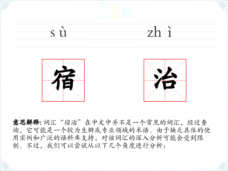 词汇“宿治”在中文中并不是一个常见的词汇,经过查询,它可能是一个较为生僻或专业领域的术语。由于缺乏具体的使用实例和广泛的语料库支持,对该词汇的深入分析可能会受到限制。不过,我们可以尝试从以下几个角度进行分析: