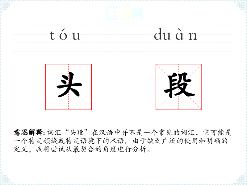 由于“头段”不是一个常用词汇,它的使用可能局限于特定的行业或专业领域,如新闻编辑中可能指文章的开头部分,或者在建筑工程中指某个结构的基础部分。