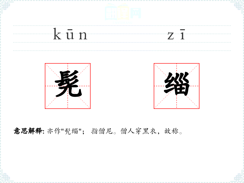 亦作"髠缁"; 指僧尼。僧人穿黑衣,故称。