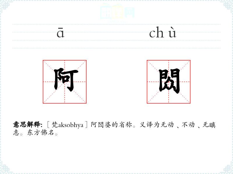 [梵aksobhya]阿閦婆的省称。义译为无动﹑不动﹑无瞋恚。东方佛名。
