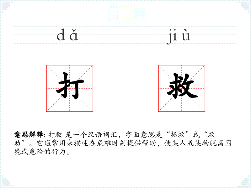 - 专业领域:在法律或救援领域,“打救”可能特指救援行动,如海上救援、灾难救援等。