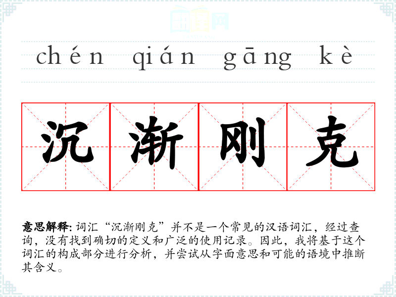 词汇“沉渐刚克”并不是一个常见的汉语词汇,经过查询,没有找到确切的定义和广泛的使用记录。因此,我将基于这个词汇的构成部分进行分析,并尝试从字面意思和可能的语境中推断其含义。