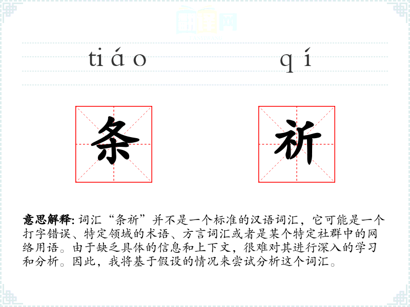 由于“条祈”不是一个标准词汇,我们无法对其进行深入的分析。在语言学*和表达中,理解和使用标准词汇是非常重要的,因为它们具有明确的含义和广泛的应用。如果遇到不熟悉的词汇,最好的做法是查找可靠的资源来确定其含义和用法。