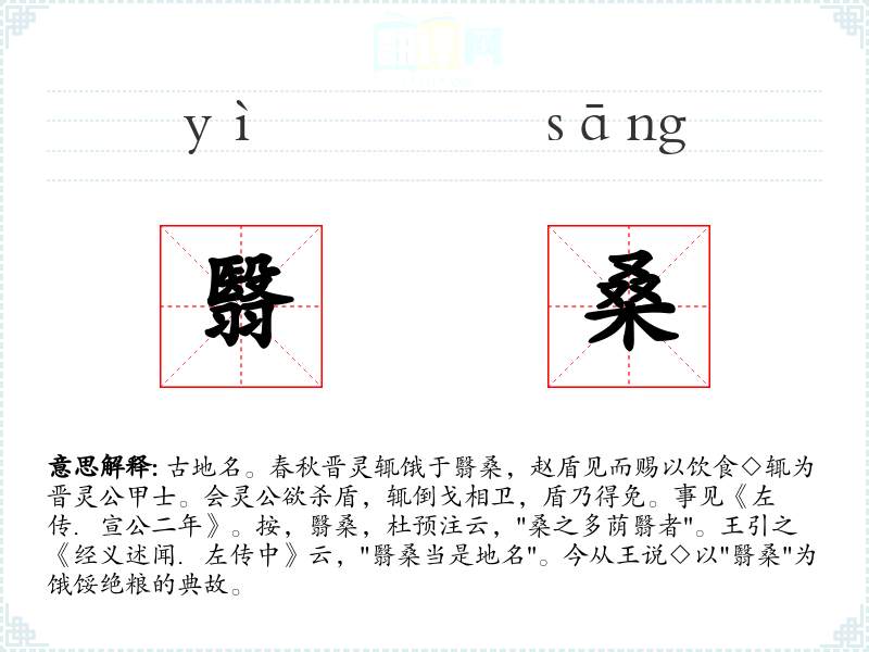 1.古地名。春秋晋灵辄饿于翳桑,赵盾见而赐以饮食◇辄为晋灵公甲士。会灵公欲杀盾,辄倒戈相卫,盾乃得免。事见《左传.宣公二年》。按,翳桑,杜预注云,"桑之多荫翳者"。王引之《经义述闻.左传中》云,"翳桑当是地名"。今从王说◇以"翳桑"为饿馁绝粮的典故。