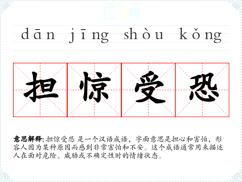 担惊受恐 是一个汉语成语,字面意思是担心和害怕,形容人因为某种原因而感到非常害怕和不安。这个成语通常用来描述人在面对危险、威胁或不确定性时的情绪状态。