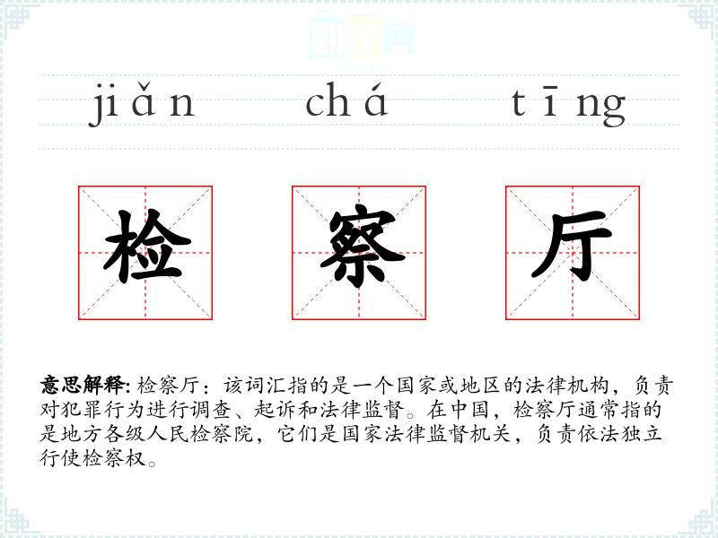 词源:“检察厅”一词源自日语“検察庁”,在法律体系中,这个词被广泛使用,特别是在描述地方各级人民检察院时。 演变**:随着法律体系的发展,检察厅的职能和结构也在不断演变,以适应社会和法律的变化。