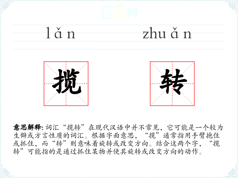“揽转”是一个较为生僻的词汇,其使用可能局限于特定语境或方言中。了解这个词汇可以帮助我们更好地理解语言的多样性和丰富性。在语言学习和表达中,虽然它可能不常用,但了解这样的词汇可以增加我们的词汇量,丰富我们的表达方式。