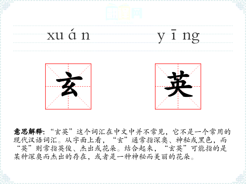 “玄英”这个词汇在中文中并不常见,它不是一个常用的现代汉语词汇。从字面上看,“玄”通常指深奥、神秘或黑色,而“英”则常指英俊、杰出或花朵。结合起来,“玄英”可能指的是某种深奥而杰出的存在,或者是一种神秘而美丽的花朵。