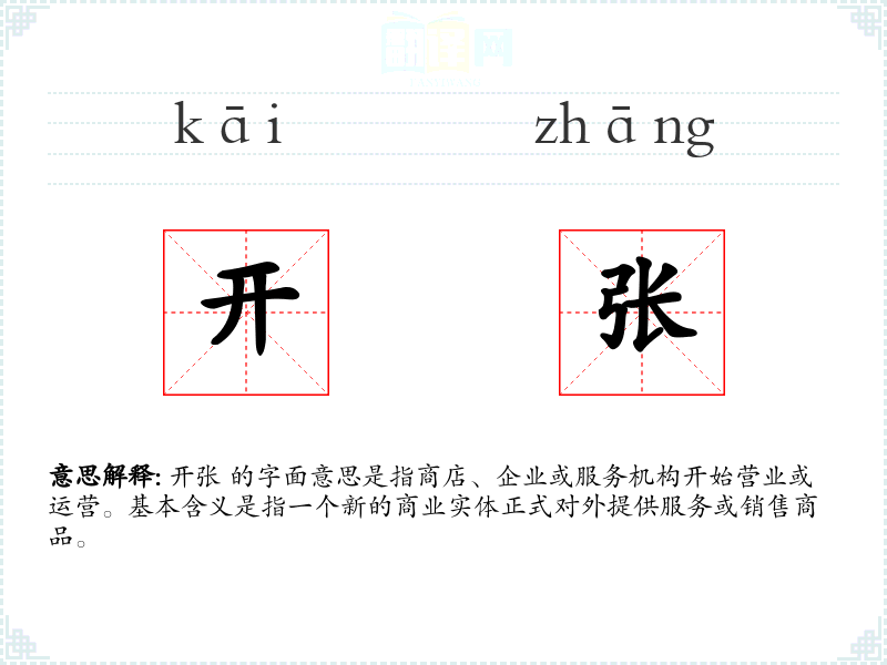 开张 的字面意思是指商店、企业或服务机构开始营业或运营。基本含义是指一个新的商业实体正式对外提供服务或销售商品。